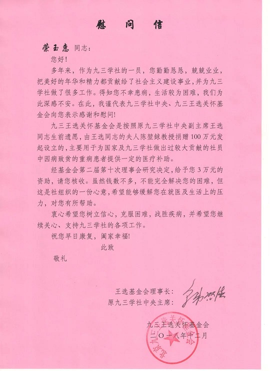 2月25日上午,省政协副秘书长、社省委专职副主委肖礼庆,带着社组织的浓浓暖意赴吉安市看望慰问吉安市困难社员荣玉惠,并送上了王选关怀基金会理事长韩启德的慰问信和王选关怀基金慰问金3万元。中共吉安市委常委、统战部长卢正大,市委常委、市总工会主席肖玉兰,社省委组织部和社吉安市委会负责人参加慰问仪式。