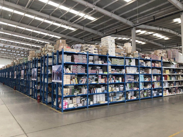 随后,梁范栋等带领大家对基地内最大的二号、三号库房进行实地参观,并详细介绍了基地内图书从出版商捐赠到入库、分类、二次分类、出库等一系列工作流程。