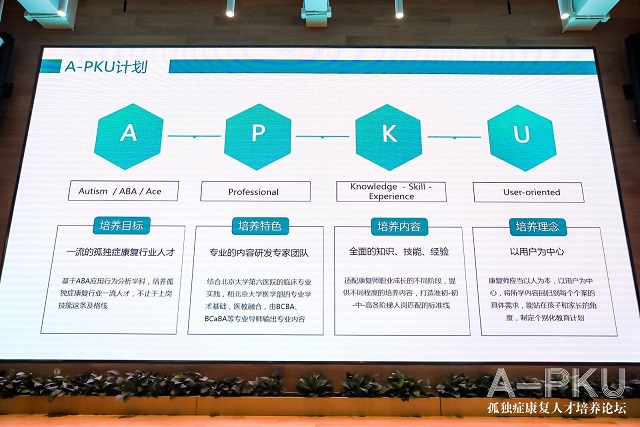 A-PKU体系旨在培养孤独症(Autism)领域、依托应用行为分析理论(ABA)进行康复教学的一流(Ace)人才。通过职业教育,他们将获得专业的职业晋升路径(Professional),习得丰富的知识、技能、实操经验(Knowledge-skill-experience),并将以人为本(User-oriented),对孩子进行有效康复,帮助孩子回归正常生活。