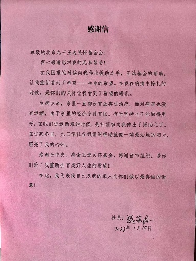 2023年1月10日下午,九三学社吉林省委“王选关怀基金” 发放仪式在长春举行,向长春市社员魏苏丹颁发了王选关怀基金3万元。