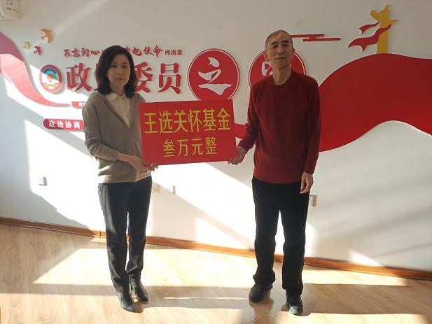 受黑龙江省政协副主席、九三学社黑龙江省委主委庞达委托,九三学社哈尔滨市委专职副主委张美华为郭景文同志发放王选关怀基金3万元;九三学社哈尔滨市委秘书长梅显凯宣读了北京九三王选关怀基金会《关于给予张宜青等三十二位九三学社社员资助的决定》和北京九三王选关怀基金会理事长韩启德亲笔签名给郭景文同志的慰问信。