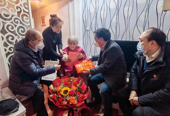 在潘月英家中,曹增武亲手转交了三万元慰问金,刘涛宣读了王选关怀基金会理事长韩启德院士的慰问信。曹增武详细询问了潘月英的生活和健康状况,叮嘱她照顾好身体,保持好心情。对潘月英同志响应国家号召支援大西北,为宝鸡社组织的发展做出重要贡献给予了充分的肯定。他强调,尊老敬老是中华民族的传统美德,也是九三学社的光荣传统。潘月英眼含热泪致谢,感谢九三学社各级组织对自己的关心和帮助。对潘月英老人来说,她得到的关爱早已超过关怀基金送来的3万元价值,她视这份关怀为社组织给予她的荣誉。