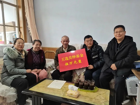 12月11日,九三王选关怀基金会专职副秘书长赵鑫,山东省人大财经委副主任、九三学社山东省委会秘书长岳鹏一行专程到枣庄、济宁看望受资助的九三学社社员涂乐道、刘海峰,并分别给他们送上了王选基金会理事长、九三学社中央原主席韩启德亲笔签名的慰问信和5万元慰问金。九三学社枣庄市委主委、枣庄市政协副主席张德琦,九三学社山东省委会组织部部长苏凯,九三学社济宁市委专职副主委刘要武,九三学社济宁市委秘书长张凤菊陪同参加活动。