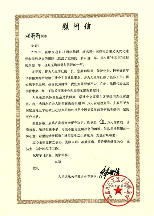 当天下午,九三学社廊坊市委专职副主委张辉、航天学院支社主委刘泽琴等赶赴冯莉莉沧州老家,刚一进门,就夸赞冯莉莉恢复得好,“气色好多了!”张辉是受社河北省委、社廊坊市委委托,专程为冯莉莉送来九三学社中央原主席、九三王选关怀基金会理事长韩启德的慰问信和社组织的关怀。此前,伍万元的关怀基金爱心资助款已在第一时间打入了冯莉莉的银行账户。 九三王选关怀基金是按照九三学社中央原副主席王选同志生前遗愿,由其夫人陈堃銶教授捐赠100万元发起设立的,主要用于为国家及九三学社做出过较大贡献的社员中因病致贫的重病患者提供一定的医疗补助。经基金会第三届八次理事会研究决定,2024年度全国共有21名社员获得九三王选关怀基金的资助,资助额度为每人伍万元。 “发动社组织力量,为冯莉莉老师争取更多支持!”刚一得到冯莉莉回乡休假期间查出重病的消息,廊坊市政协副主席、社廊坊市委主委田景红就迅速做出指示。社廊坊市委第一时间联络社沧州市委,在社沧州市委领导和社员的共同帮助下,冯老师顺利就医,有序开展治疗,病情得到有效控制。廊沧两地社市委领导还一同到医院看望冯老师,送上殷殷关怀,并发动广大社员,指导冯老师进行特殊门诊疾病申报,解答异地费用报销等问题,解决了后顾之忧。 与此同时,在接到社河北省委关于2024年度九三王选关怀基金会申请资助工作通知后,社廊坊市委及冯莉莉所在基层组织——航天学院支社与冯莉莉工作单位积极协调,迅速准备资助申报材料。社省委了解到情况后,对申报工作给予事无巨细的指导,加大与基金会沟通力度。 “已经收到伍万元资助金!”经九三王选关怀基金会理事会审定,冯莉莉获得2024年度王选关怀基金的资助,提交银行账号后,资助金一天内就顺利到账! 冯莉莉表示,自从患病以来,社组织给予了无微不至的关怀,关怀基金的资助更是大大缓解了就医压力,让自己感到极大的精神鼓励,真真切切体会感受到社组织对社员的爱护和九三学社大家庭的温暖。目前,后续治疗准备顺利,正在等待医院进一步通知,自己也充满了信心,将带着九三学社各级组织的大爱,经受疾病考验,争取早日康复,重返工作岗位,做出更多贡献! 九三有大爱,冬日送暖阳! 据查,自2007年以来,九三学社廊坊市委共有孙昌群、李菁、冯莉莉三位社员获得九三王选关怀基金会资助,资助金共计9.5万元。这份关心关爱,不仅温暖了患病困难社员,更传递了九三学社中央、省、市、基层各级社组织的责任担当,感染和激励着广大社员追寻王选等九三先贤的足迹,接棒传承、砥砺前进,以更高的政治责任感和社会责任感做好“九三人”!.jpg)