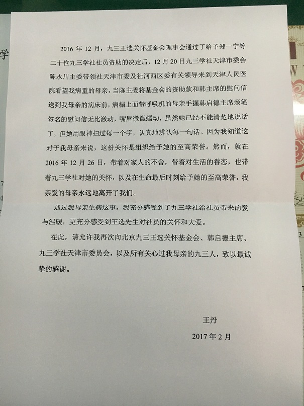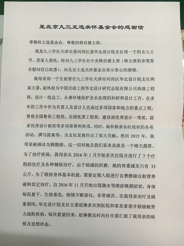 2017年5月,九三学社天津市委员会收到一封题为“致北京九三王选关怀基金会的感谢信”的信函。此封来信是2016年王选关怀基金受助人——天津九三社员郑一宁(已故)女儿委托九三学社天津市委会转交给王选基金会和韩启德主席的,以表达一位基层社员家属对社组织关怀的感激之情。